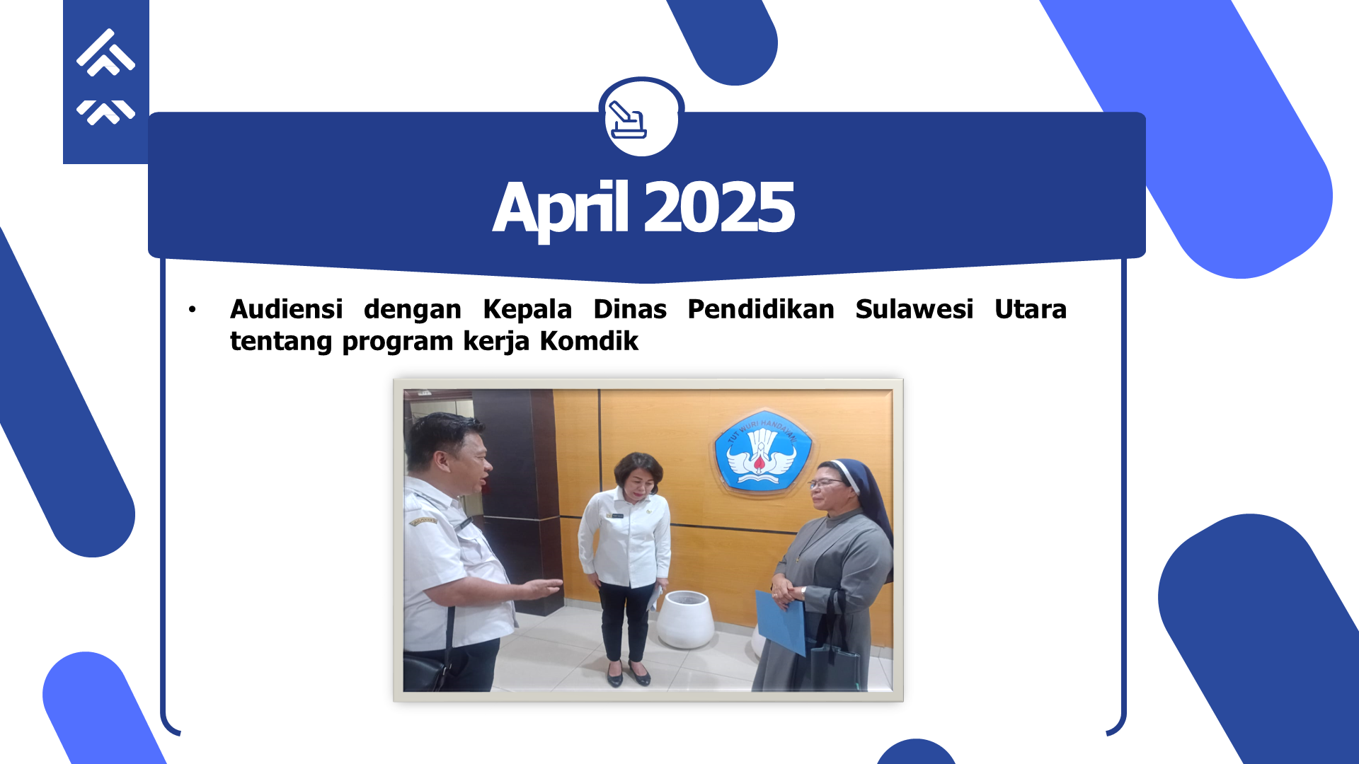 - Pertemuan dengan Sekretaris Eksekutif Komdik KWI Jakarta bersama dengan Pengurus MPK, Yayasan-Yayasan Katolik-KM, dan seksi Pendidikan Paroki Keuskupan Manado